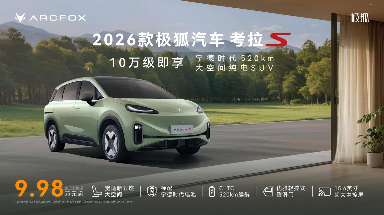 1月13日,极狐汽车 2026 款考拉 S 车型正式上市,共包含 520 AIR、520 PRO、520 MAX 三个版型,官方指导价分别为 9.98 万元、10.98 万元、11.98 万元。新车定位五座纯电家用 SUV,推出6重购车及用车权益芝麻财富,并且上市即交付。